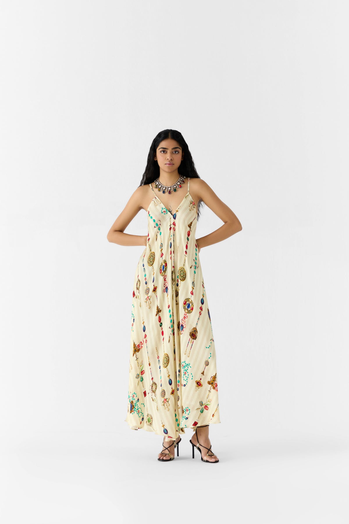 The Tijori Strappy Dress crafted from our stunning vegan silk fabrication, trans-seasonal, is a statement piece. This dress, printed in our jewels tijori print, is an asymmetric dress. The strappy dress is a-line with adjustable straps. With an asymmetric cut, it looks stylish. Wear it with heels for an elegant look.