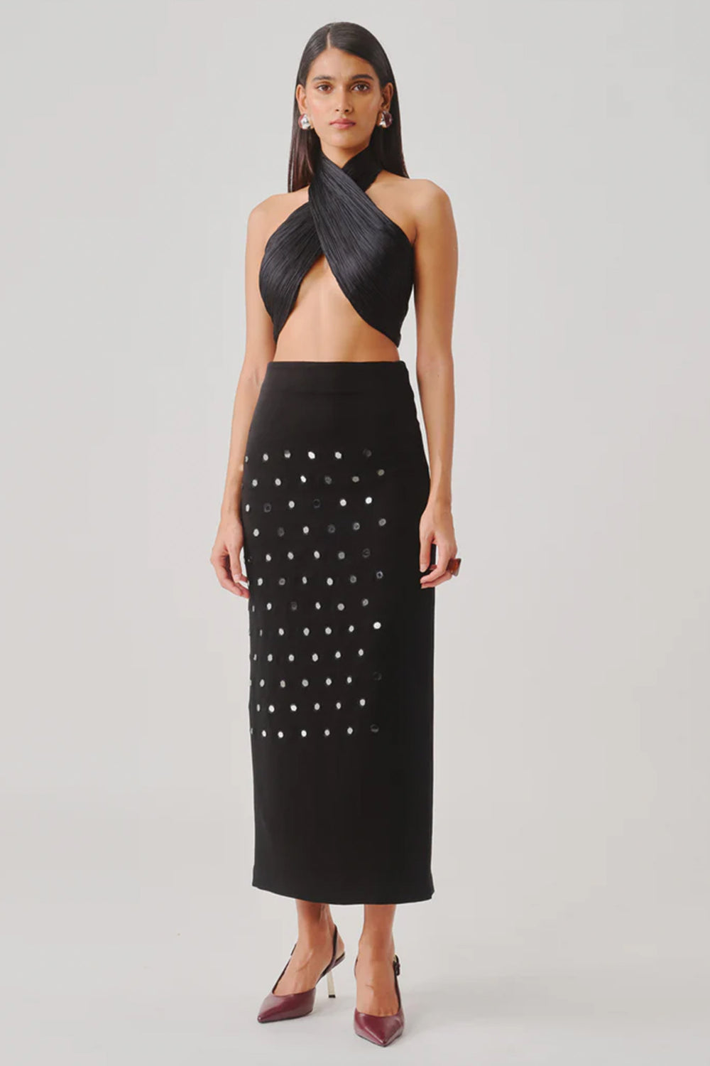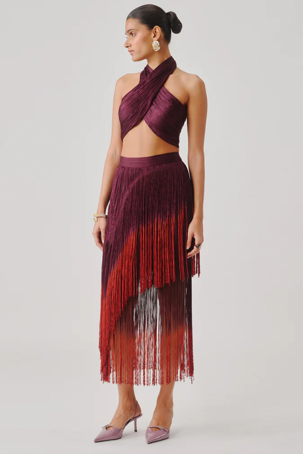 Plum Net Sequin-Bugle Bead Embroidered Halter Top