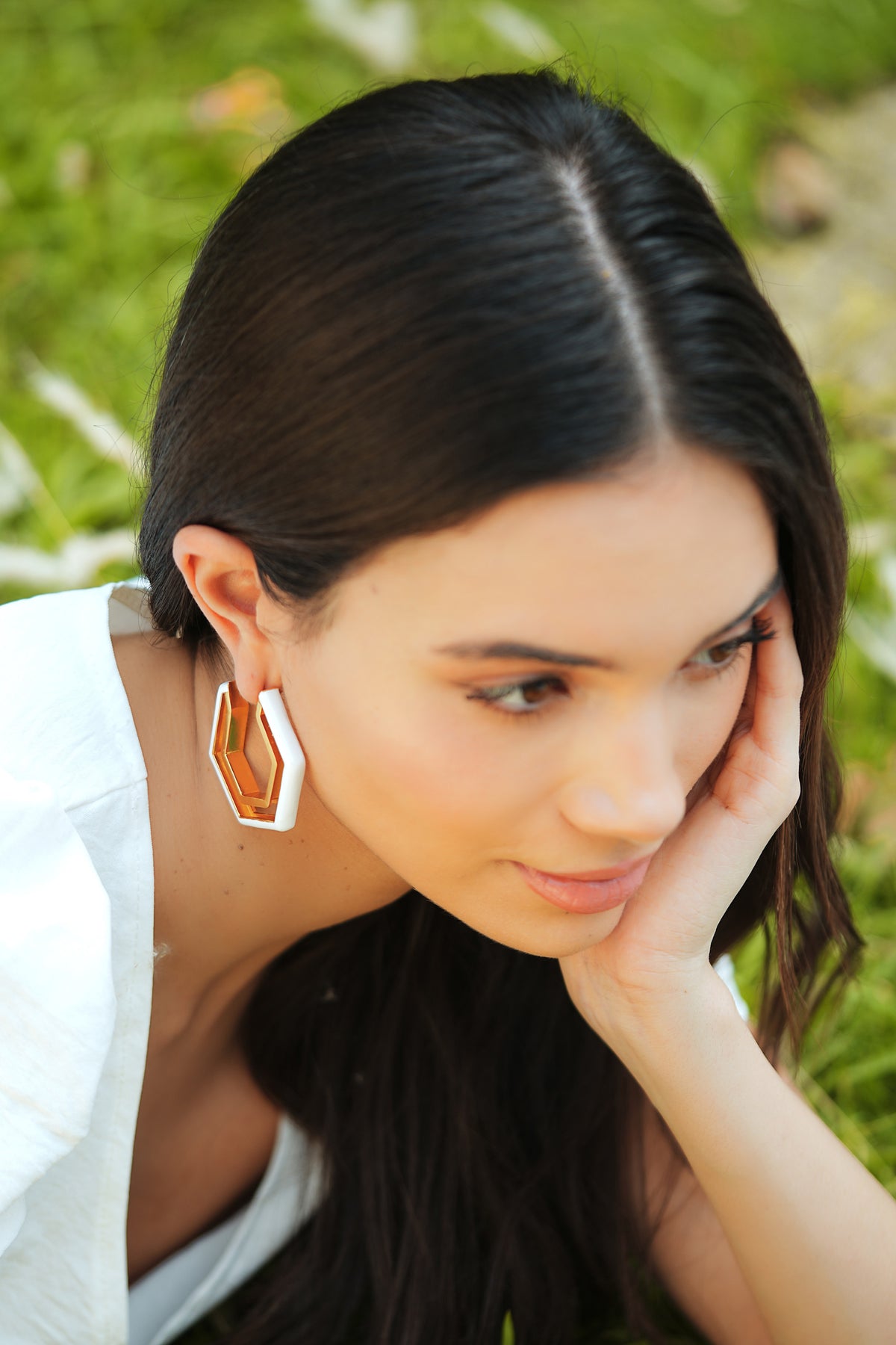 Make a bold impression with these statement hexagonal hoop earrings, where sharp lines meet smooth curves in perfect harmony. Crafted in high-shine gold and edged with a white enamel, these earrings are a modern twist on classic geometry. The angular silhouette offers a confident, contemporary flair, while the rich white border adds a striking contrast that captures the light—and attention. Ideal for both standout day wear and glamorous evenings, these earrings are designed for those who dare to be different.