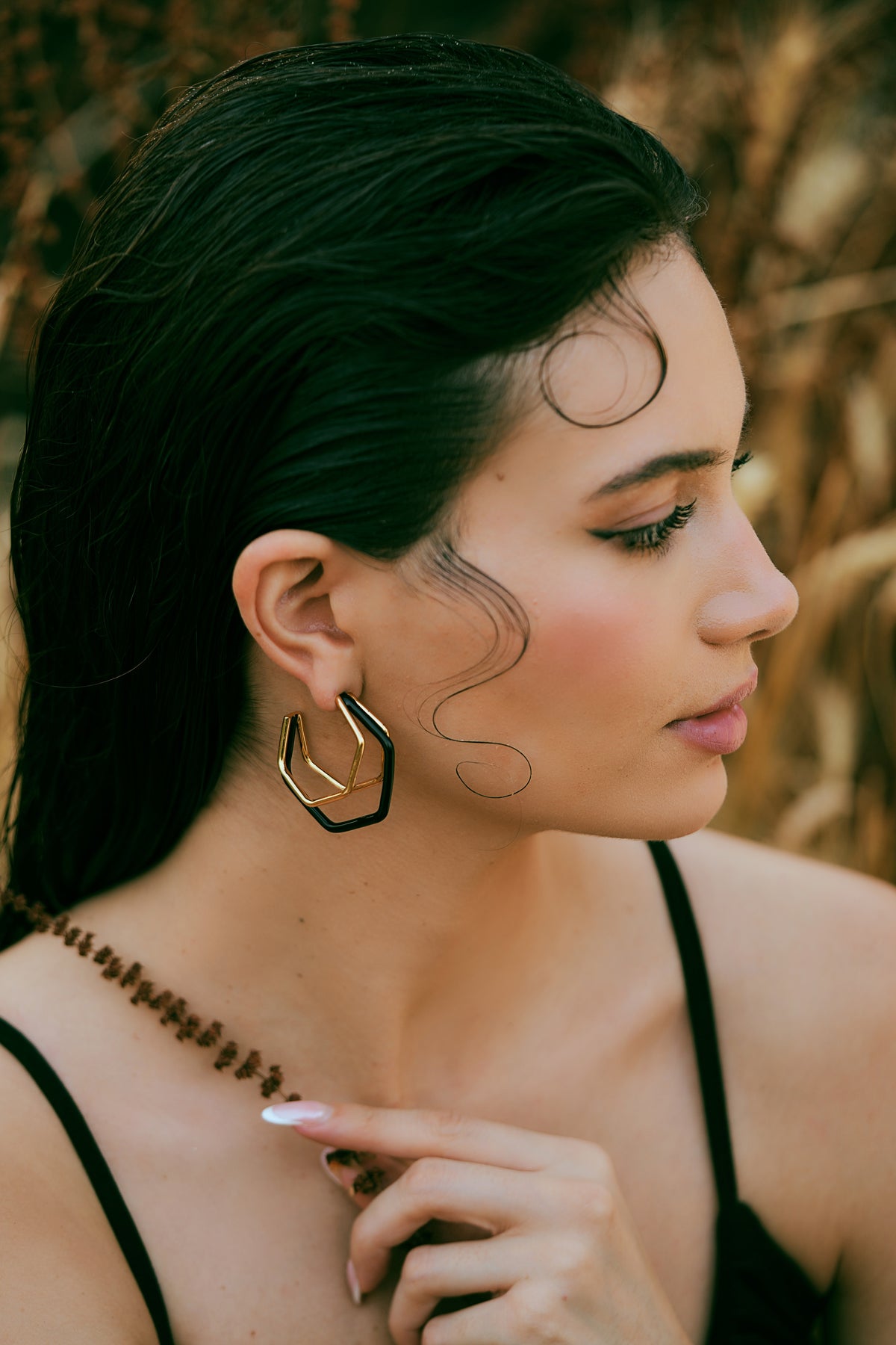 Elevate your style with these striking geometric hoop earrings, where modern elegance meets bold design. Featuring interlocking hexagonal shapes in rich gold and black, these earrings make a statement with their unique structure and vibrant contrast. Perfect for both daytime charm and evening sophistication, they add a touch of contemporary luxury to any look. Lightweight and eye-catching, they’re the ultimate accessory for the fashion-forward woman.