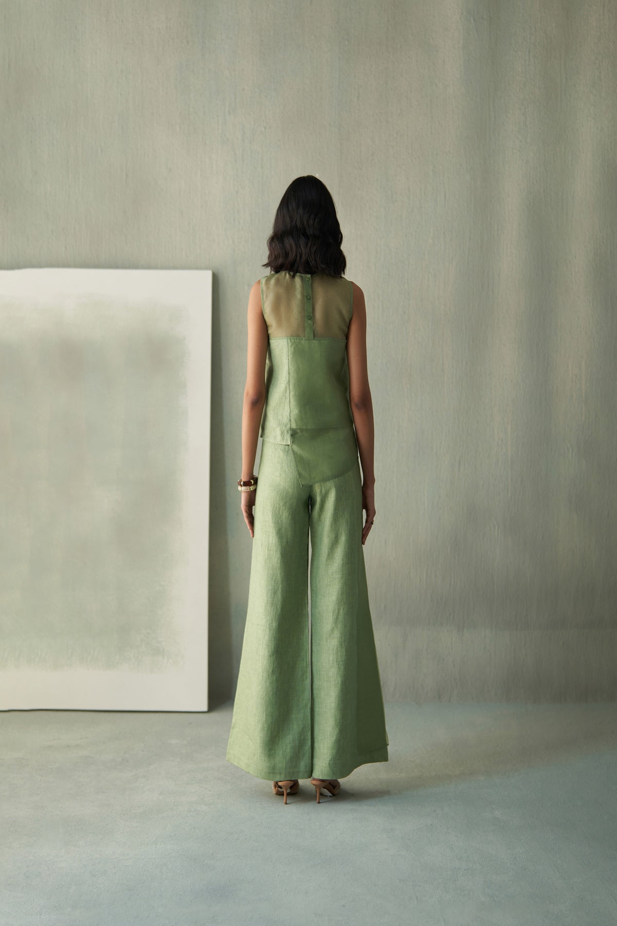 Crafted in an earth green hue, this co-ord set captures effortless blend of organza and linen. The sleeveless asymmetric top features a sheer organza yoke and delicate hand-embroidered pod motifs, paired with wide-leg trousers that fall fluidly for a relaxed yet refined silhouette. Breezy, elegant, and timeless — a perfect blend of minimalism and artistry for elevated daywear.