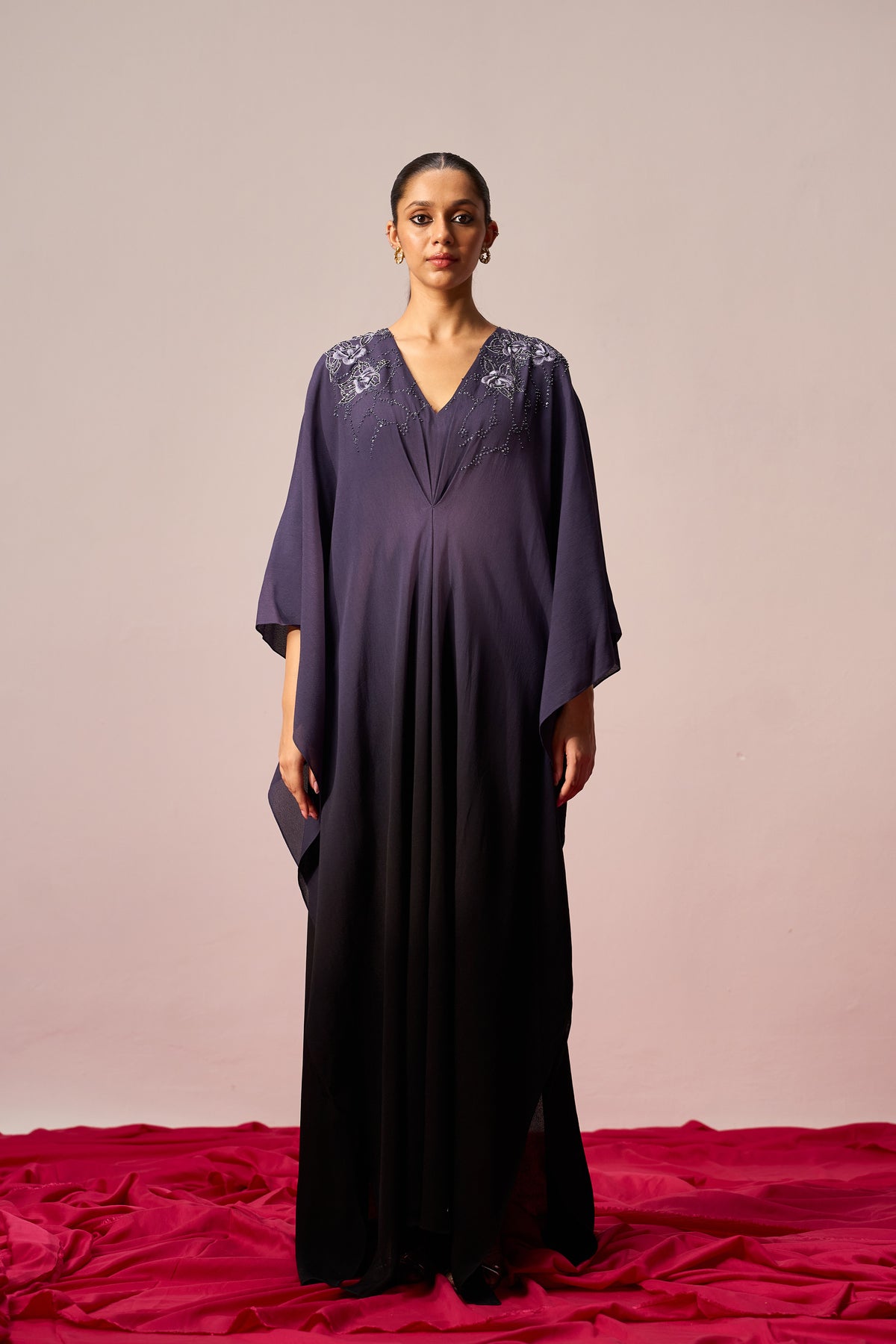 V neck long kaftan with embroidery, detailing front and has a pin tuck detailing at the front look perfect for modern-day elegance.
