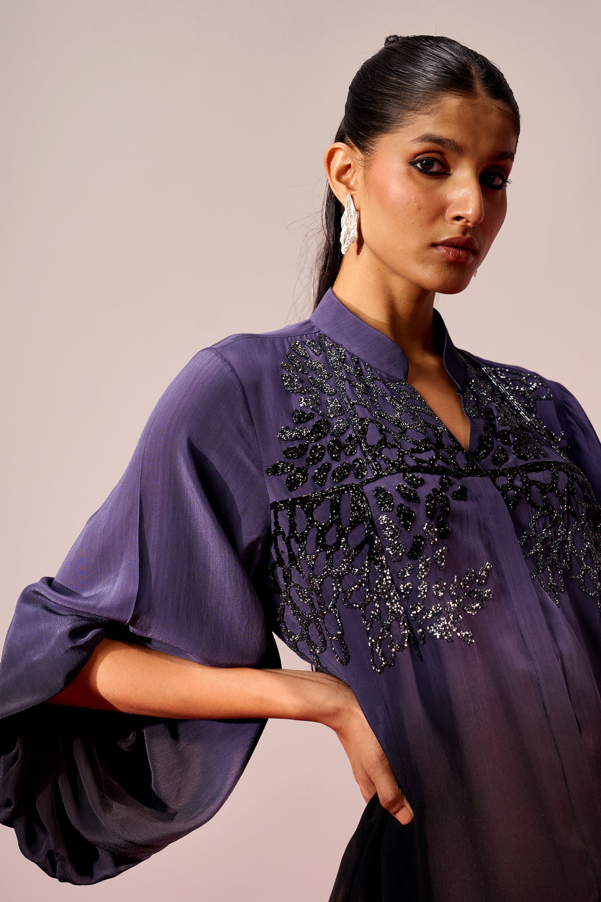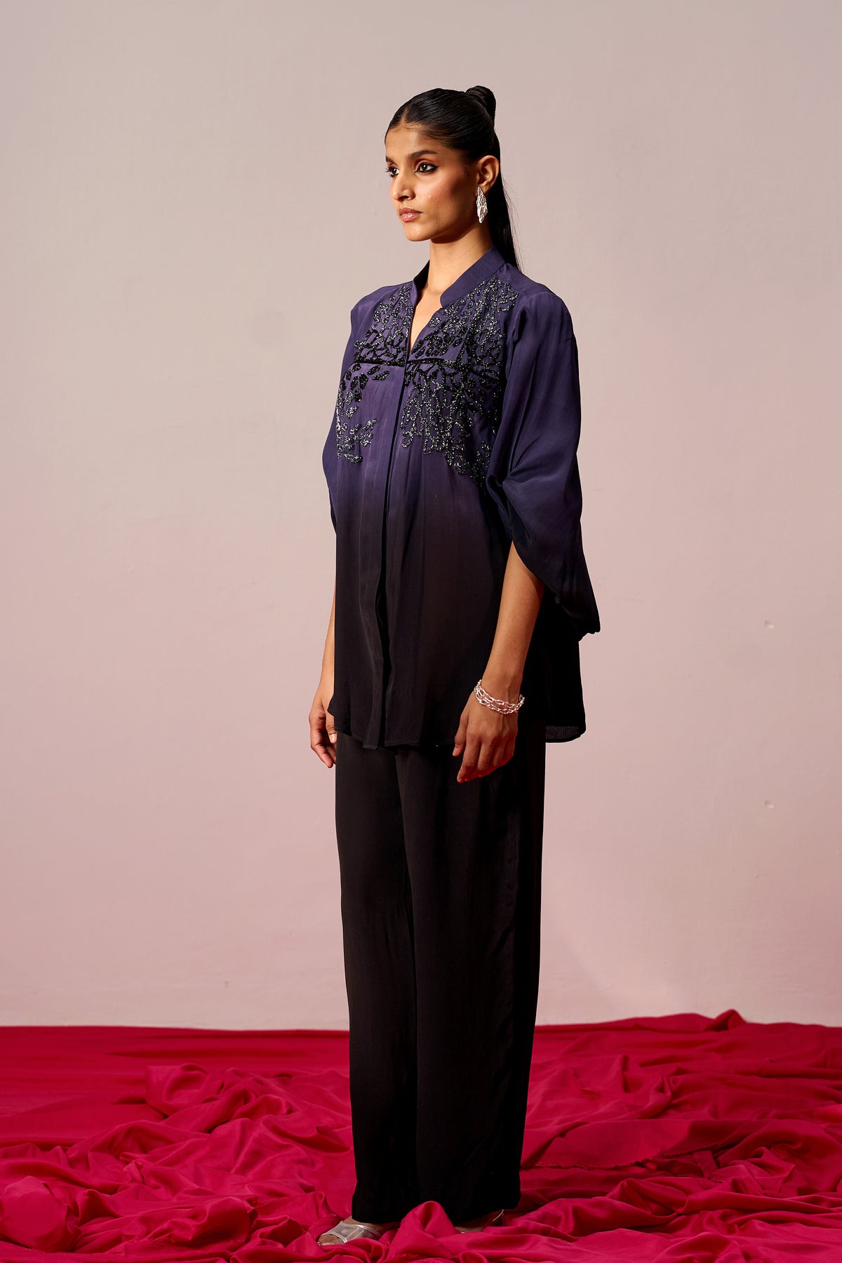 Regular fit shirt with embellished with delicate hand embroidery, oversized elasticated sleeves, paired with sleek straight pants for an elegant everyday impression.