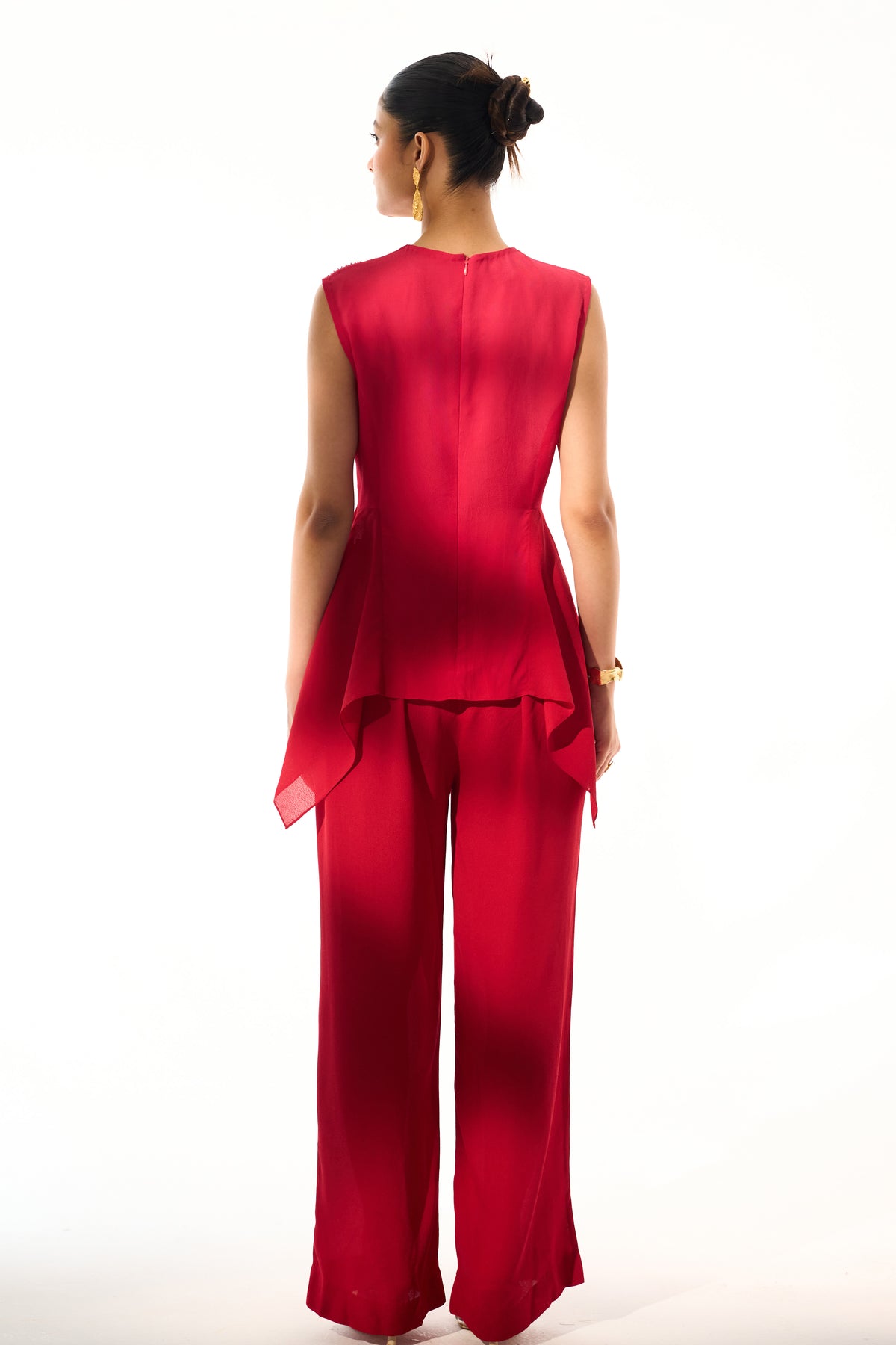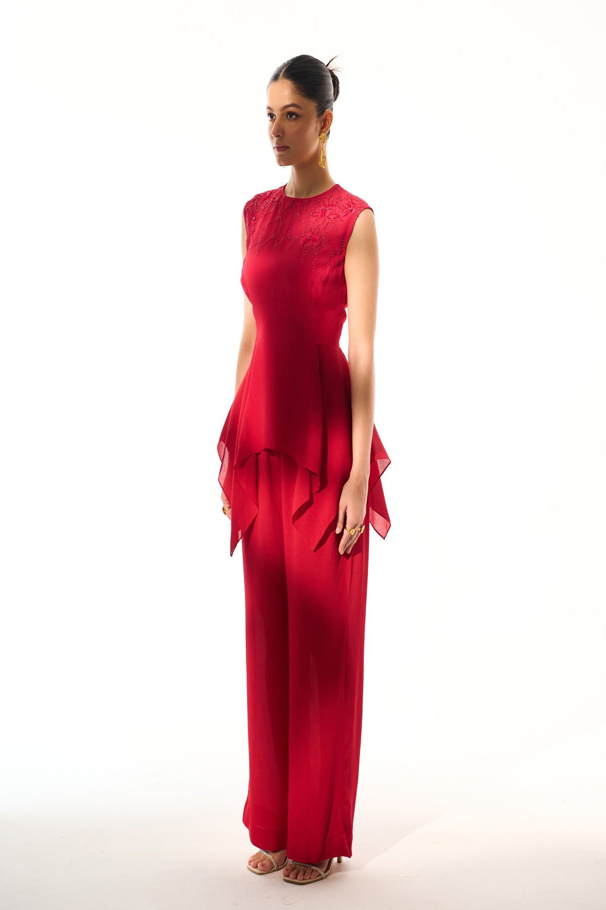 Sleeveless fitted peplum top featuring intricate embroidered neck and graceful side flared detailing, elegantly paired with straight pants