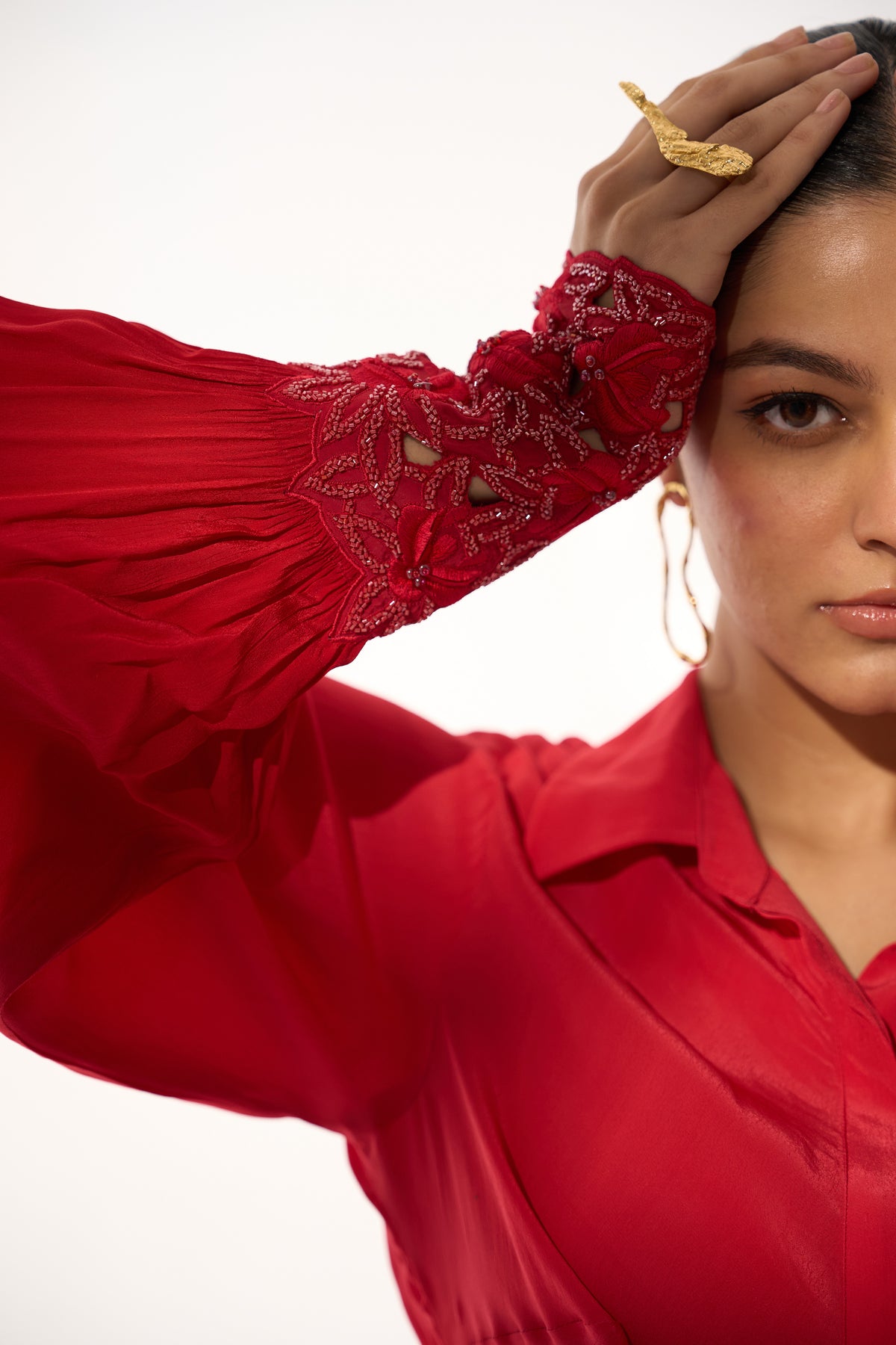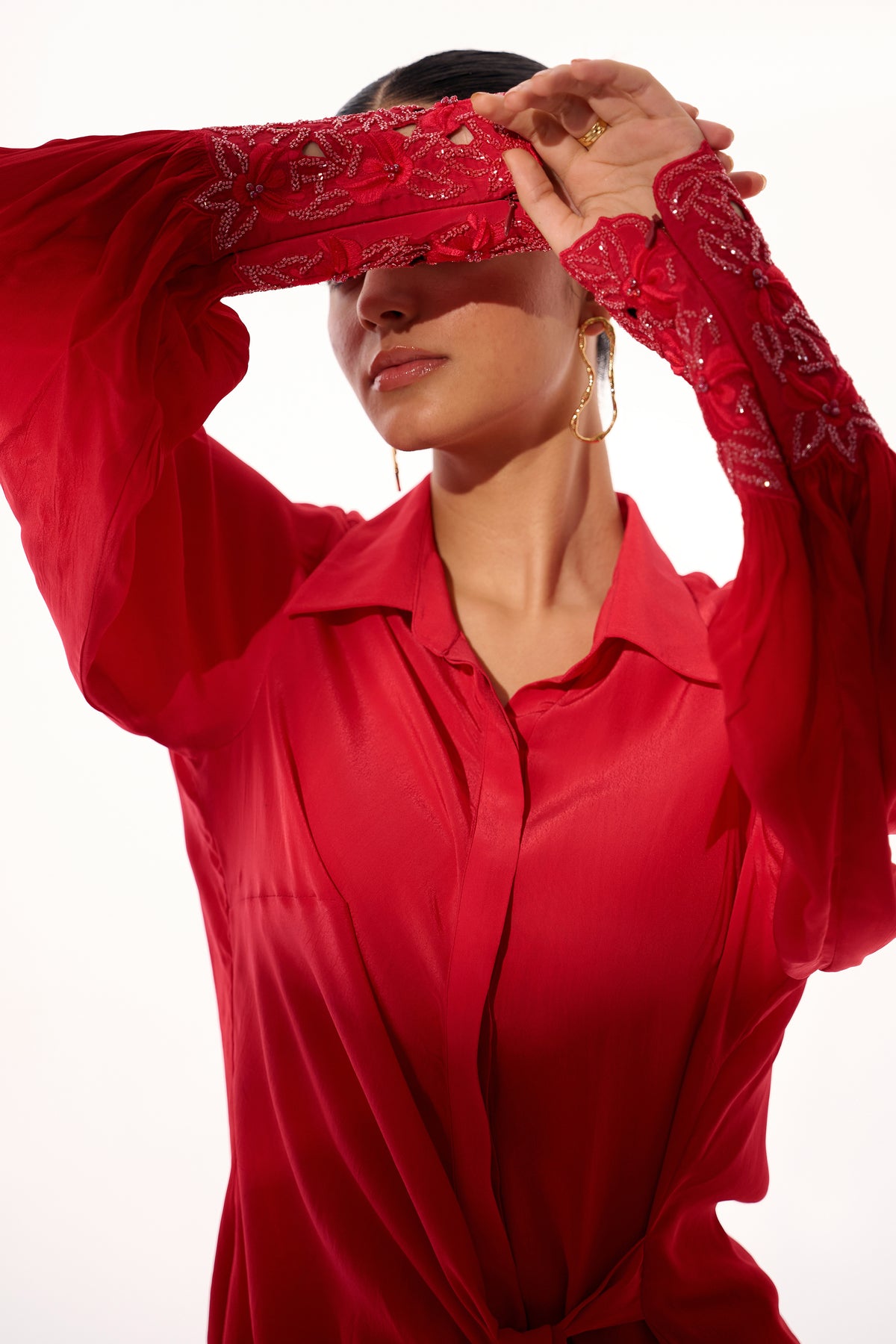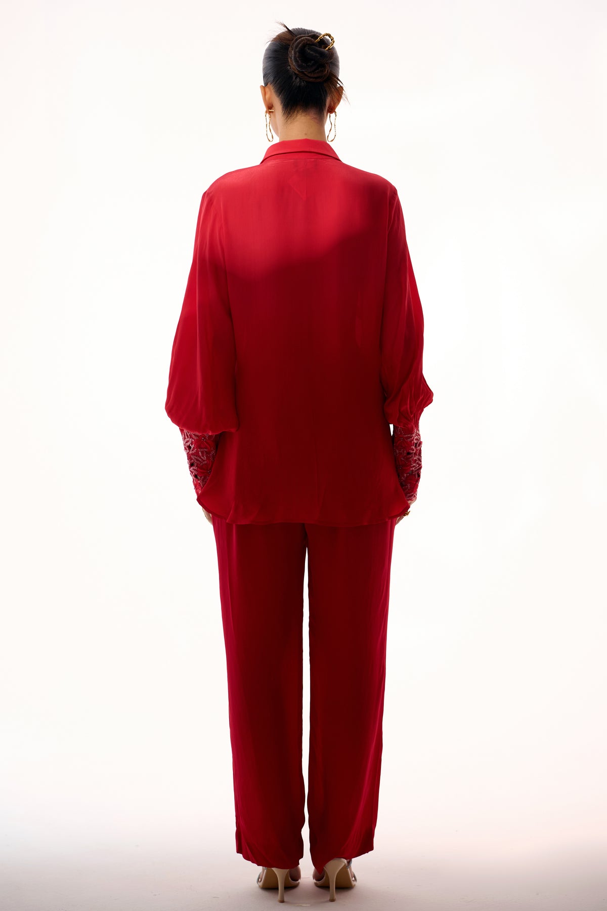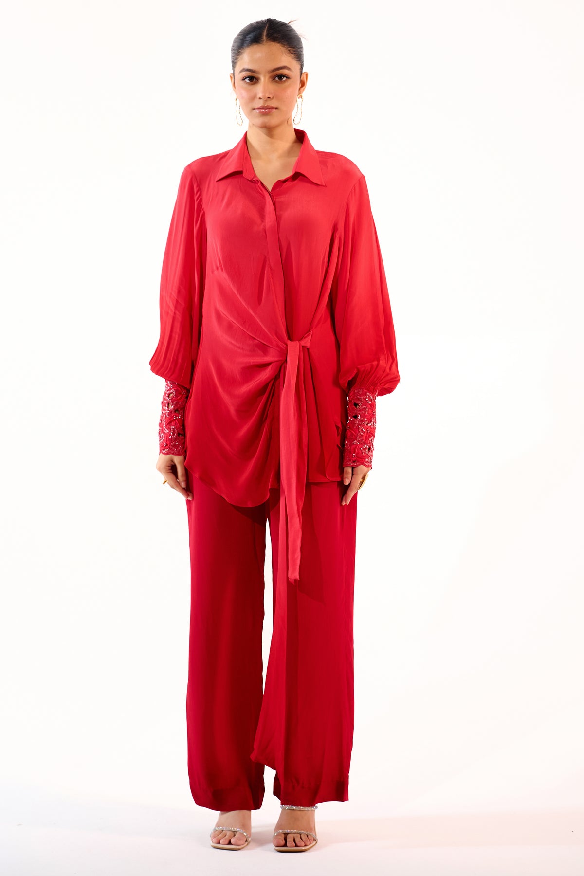 An elegant asymmetric tie up shirt with intricate embroidery cutwork cuffs, paired with straight pants blends comfort and style.