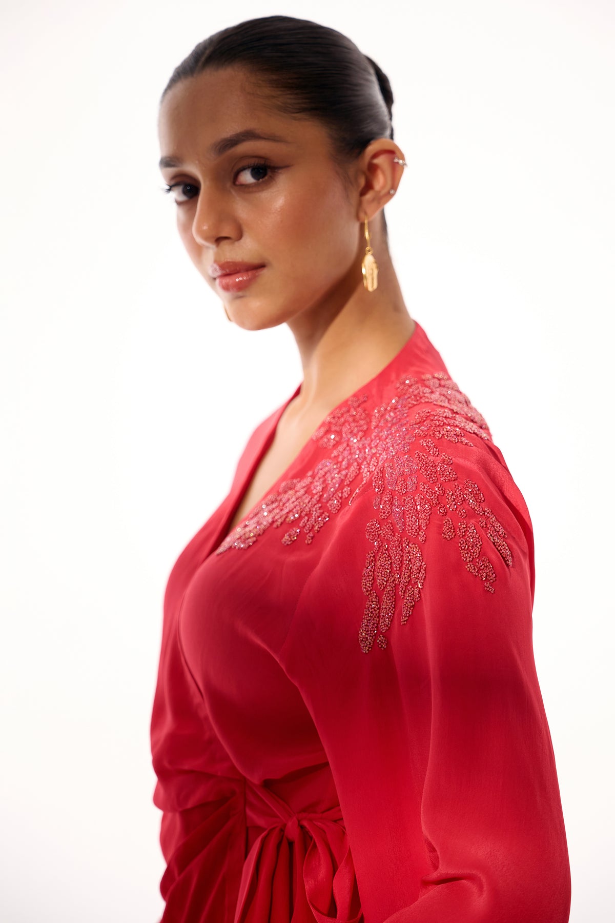 Sophisticated wrap - around style shirt with shoulder embroidery, paired with tailored straight pant for a regal look